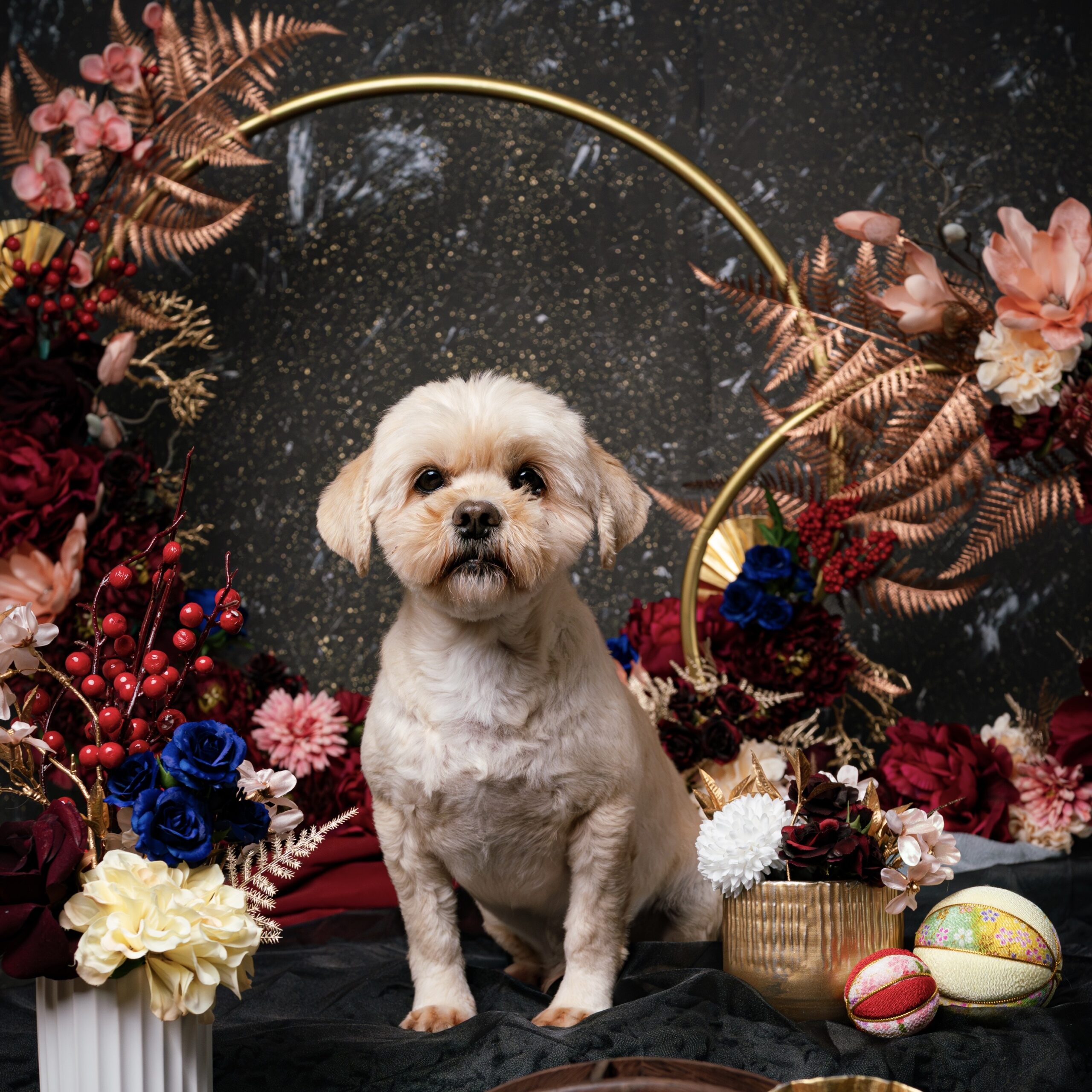 花イス撮影/お花アフロ/カラー背景撮影。 自分の好みに合わせた様々なバリエーションで愛犬撮影を楽しみたい方向け。
