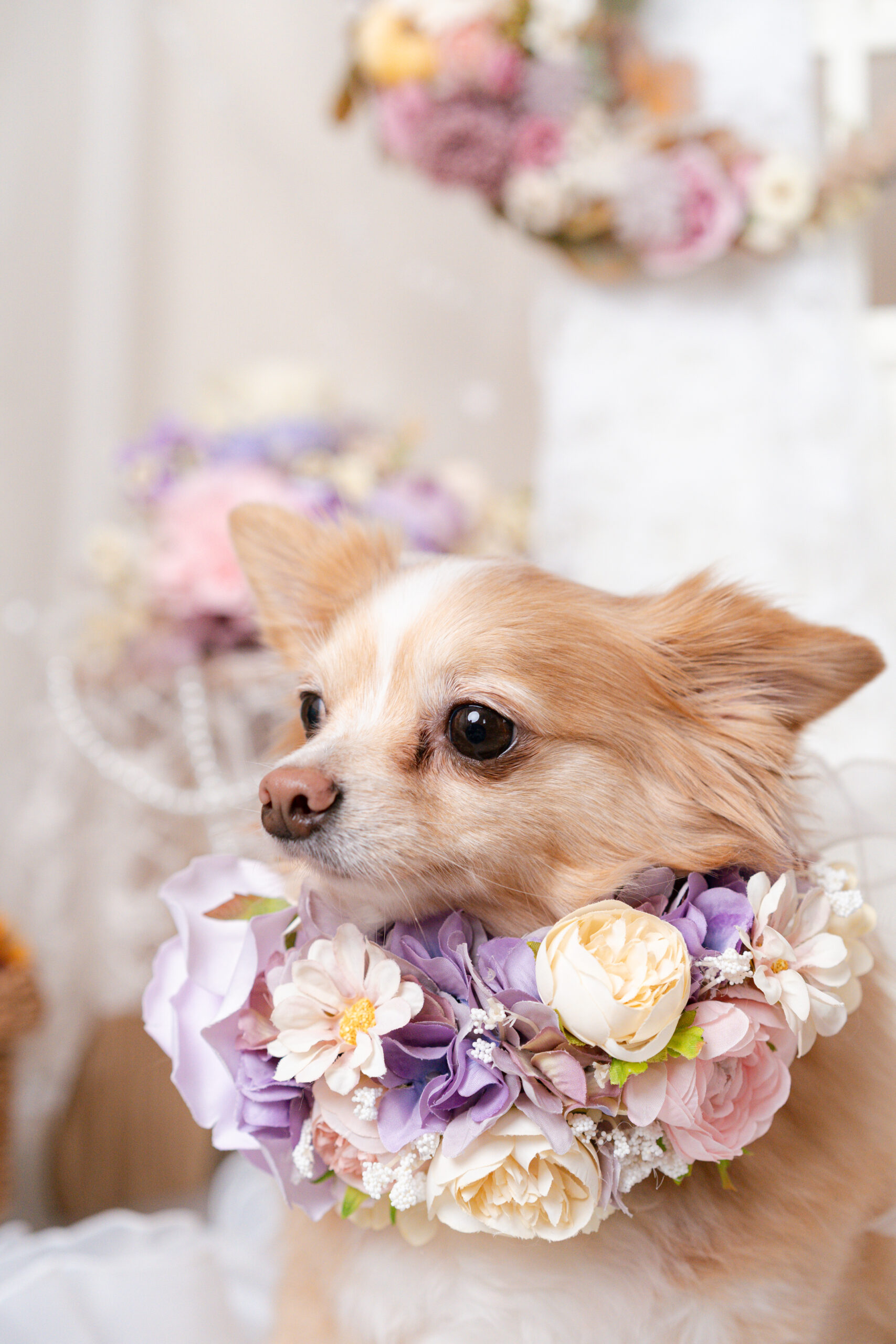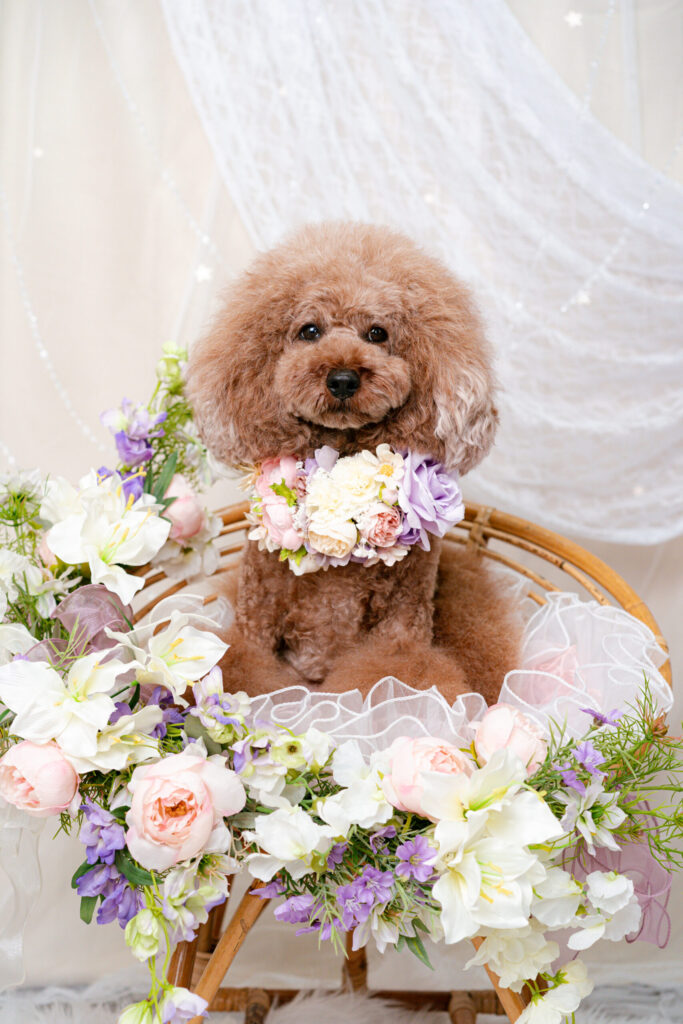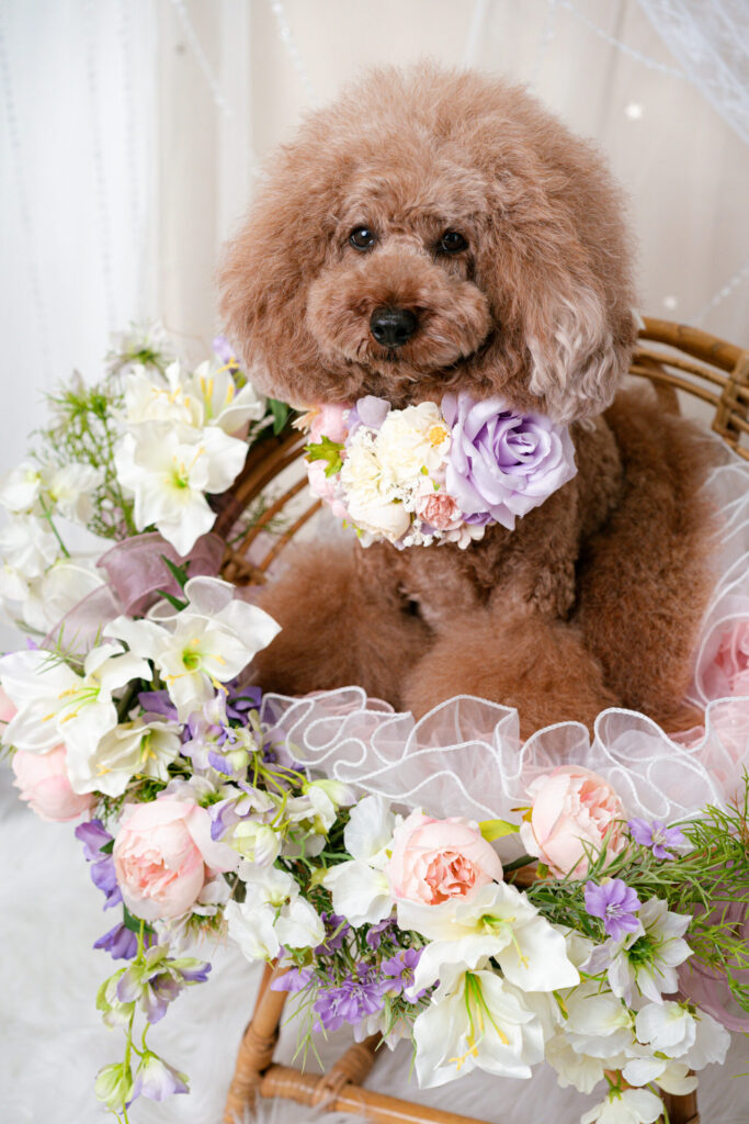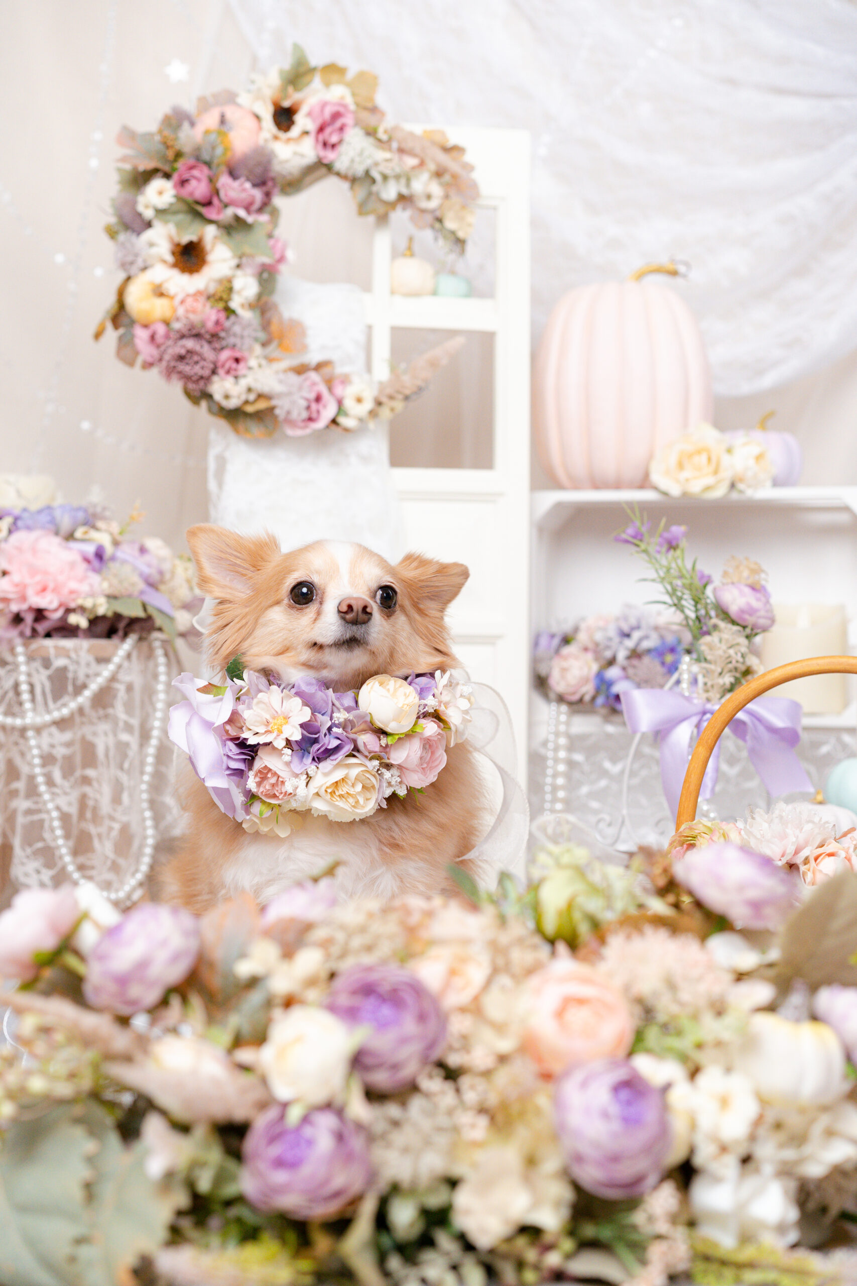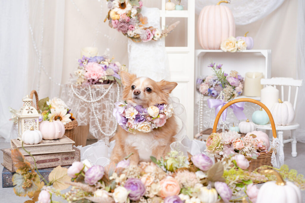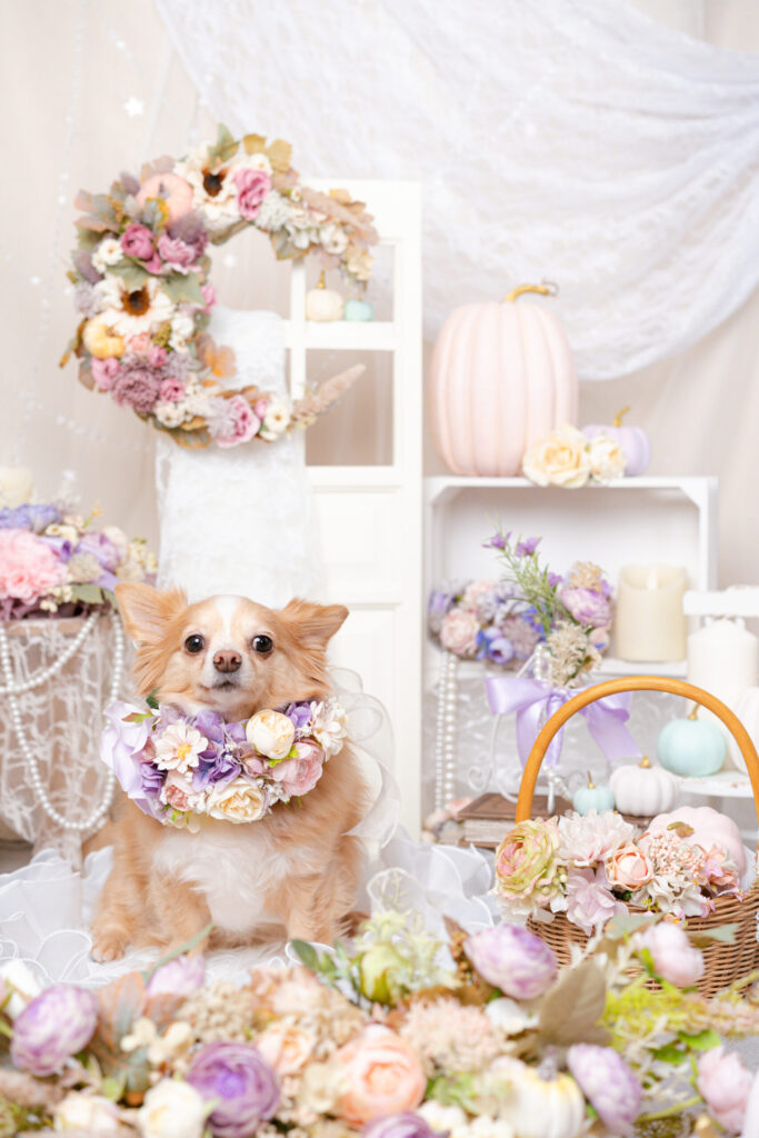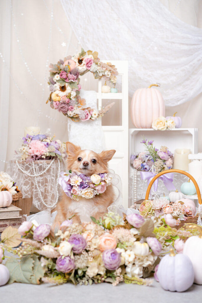 お花で作られた月やパステルカラーのかわいいお花のアレンジ。パープル、ピンク、ブルーのかわいらしいカボチャたちが愛犬のかわいさを引き立てます。